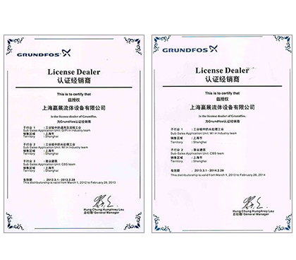 上海贏展流體設備有限公司是一家以水泵業(yè)務為主的流體設備銷售公司,2009年成立于上海。公司于2010年與格蘭富廠商正式簽訂代理協(xié)議,并取得授權代理證書;2014年格蘭富授權我司成立獨立的售后服務中心,是一家專業(yè)從事環(huán)保設備、機電設備、技術改造、安裝服務的銷售服務公司。